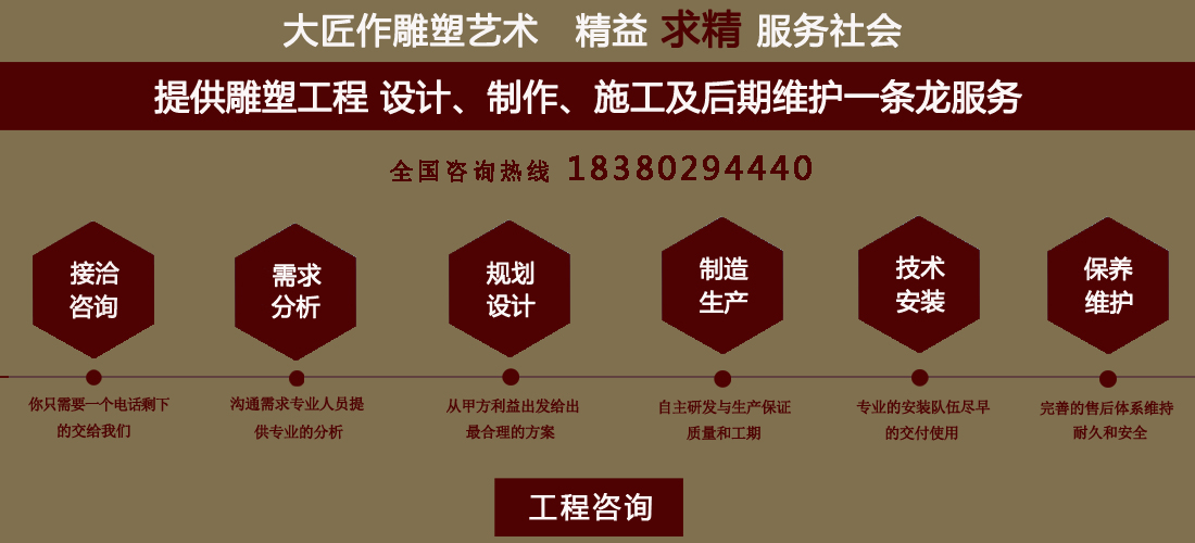 成都大匠作雕塑有限公司,是經(jīng)成都工商局審定注冊的正規(guī)專業(yè)雕塑制作及工程安裝服務(wù)機構(gòu),是由一群年輕富有朝氣的年輕人創(chuàng)辦,發(fā)軔于四川省成都市龍泉驛區(qū)。它是一家******于創(chuàng)作、制作和銷售為一體的公司。大匠作擁有多年從事公共藝術(shù)的專業(yè)人員和雕塑制作人組成的核心團隊,為您提供專業(yè)、具創(chuàng)新的設(shè)計及制作服務(wù)。公司成立以來,秉承“******服務(wù)、誠信為本”的宗旨,以客戶需求為目標導(dǎo)向,不斷學(xué)習(xí),進取,優(yōu)化和提高服務(wù)質(zhì)量,公司向您******——“您的滿意***是我們的信譽”,我們將以飽滿的熱情和******的服務(wù)贏得您的贊譽和支持。